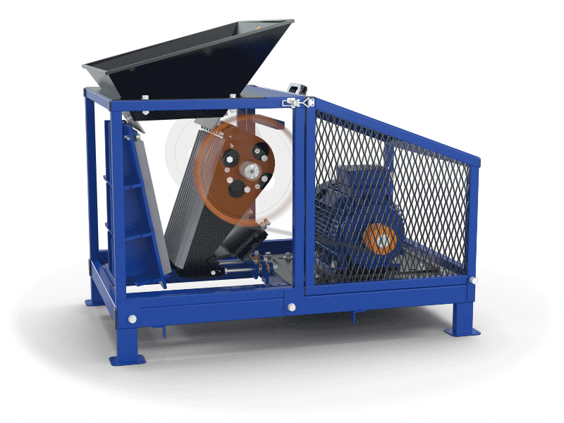 Moduł BIZON-300 działa na zasadzie mechanicznego zgniatania materiału między szczęką nieruchomą a ruchomą, która porusza się po eliptycznej trajektorii dzięki napędowi z wału mimośrodowego. Gdy ruchoma szczęka zbliża się do stałej – materiał zostaje ściśnięty i rozkruszony. Następnie przesuwa się w dół komory kruszącej i opuszcza urządzenie po osiągnięciu wymaganej wielkości frakcji, którą można regulować poprzez ustawienie szczeliny między szczękami.