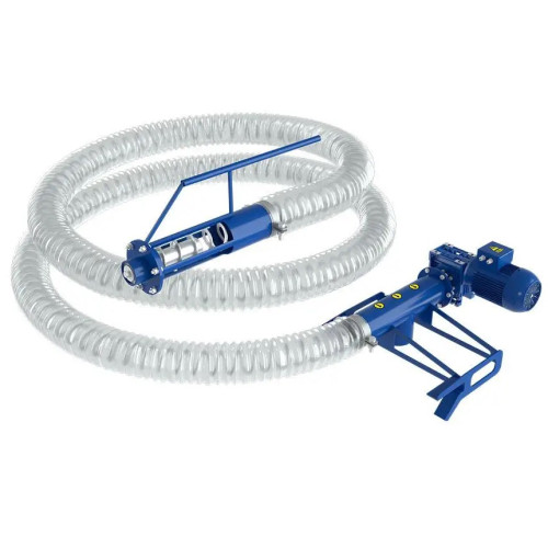 Przenośnik działa na bazie sprężynowej spirali umieszczonej wewnątrz wytrzymałej poliuretanowej rury karbowanej. Ruch spirali napędzany jest przez silnik z motoreduktorem, co umożliwia płynny transport materiałów na określoną wysokość lub odległość. Surowiec pobierany jest przez końcówkę zasysającą i przemieszcza się wewnątrz rury w stronę wylotu, który może być zamocowany np. na krawędzi pojazdu transportowego lub w silosie.
