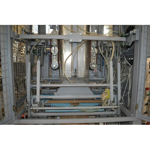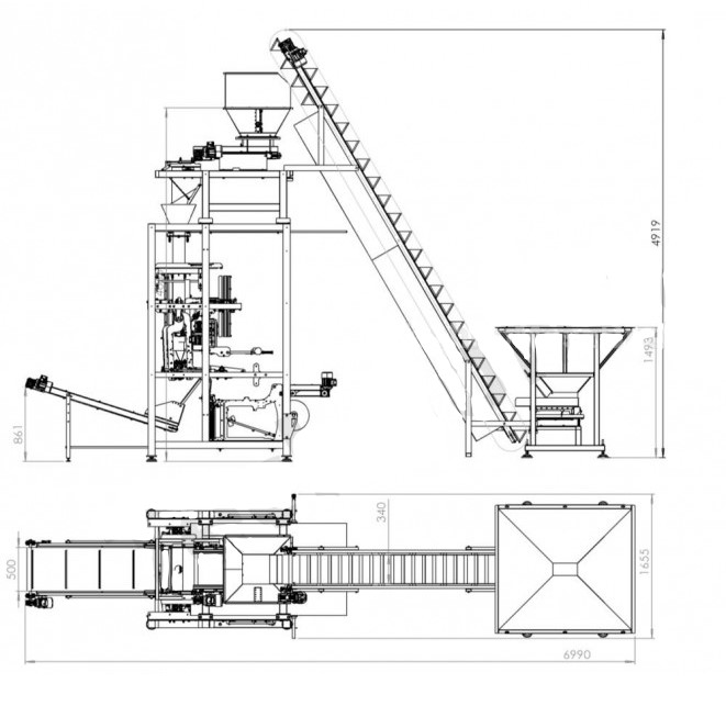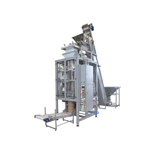 Załadunek produktu do leja zasypowego maszyny odbywa się za pomocą przenośnika kubełkowego współpracującego z lejem zasypowym. Przenośnik wyposażony jest w układ sprzężenia zwrotnego z maszyną, który pozwala na kontrolę stałego poziomu produktu w leju zasypowym maszyny. Wyjmowanie gotowych worków wypełnionych produktami odbywa się za pomocą przenośnika odbierającego.